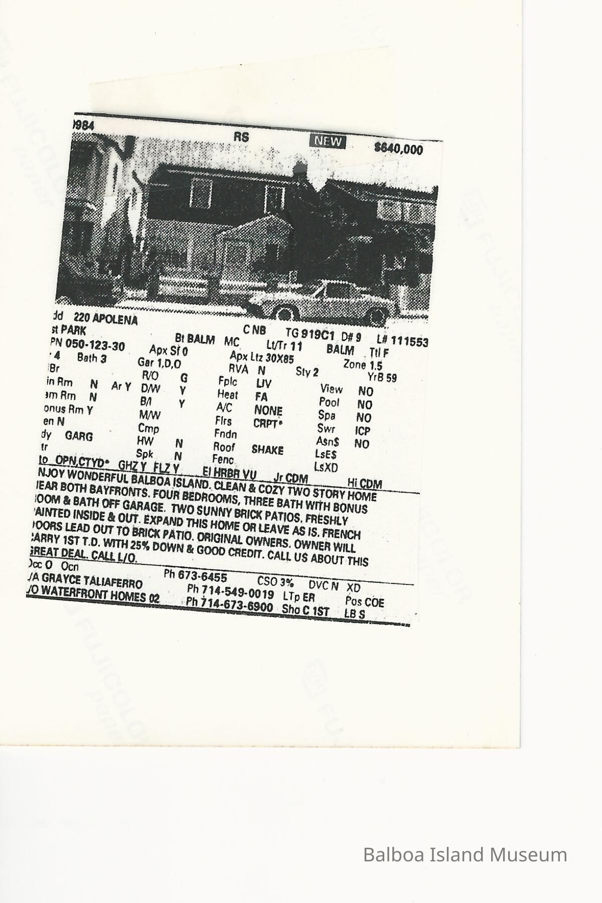 A color photograph of 220 Apolena Avenue. The house is still there as of November, 2017. The house has been remodeled slightly though with the left front window having been replaced by a bay window.Lexicon