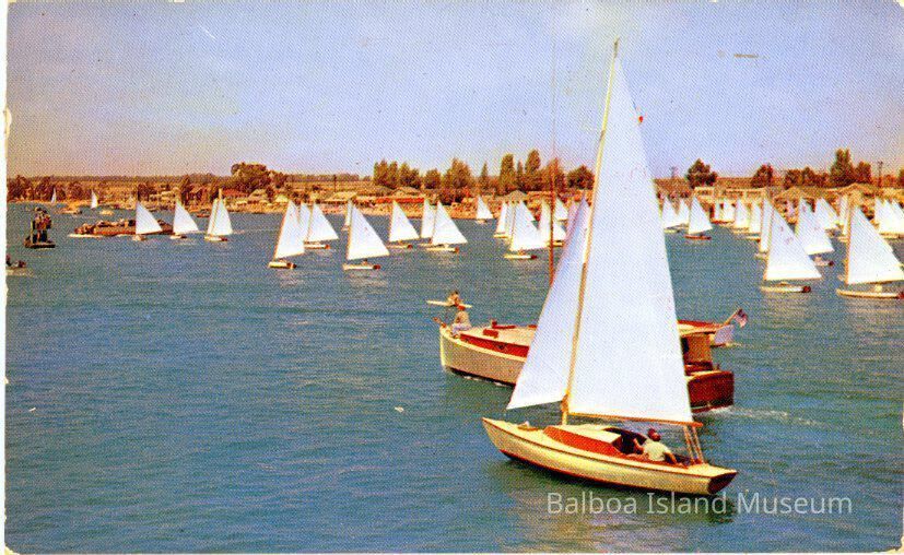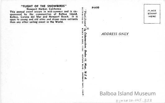 Three copies of a color postcard of a sailboat passing a motorboat during the flight of the snowbirds with the rest of the flight on the other side of the motorboat. There is a ferry ahead and a near collision appears imminent. Writing across the front in cursive reads: Flight of the "Snowbirds".