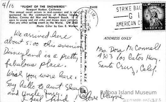 We arrived here about 5:00 this evening. Disneyalnd is a pretty fabulous place. Wish you were here. Say hello to Aunt Skee [?] and Uncle Jerry. I feel find!