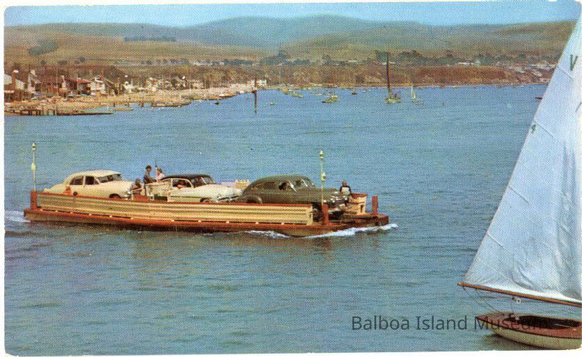 A color photograph postcard featuring the Balboa Island ferry crossing the harbor with three cars on board. There is a sailboat on the right edge of the image which appears docked. The photograph was taken looking up the harbor towards the hills.