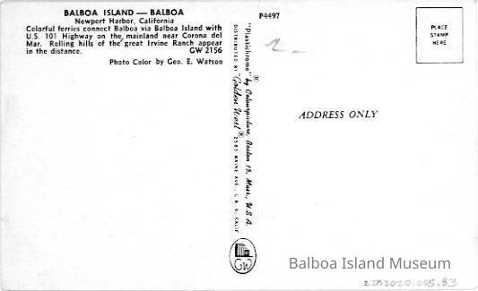 Never sent.There is a blurb on the back about the Balboa Island Ferry. Published by Golden West in Long Beach, made by Colorpicture in Boston. The photograph game from George Elton Watson. Postcard number GW 2156 and P4497. Stamp box reads: "Place Stamp Here' inside a solid box.Subject
