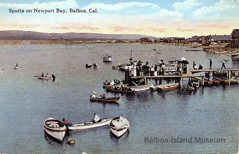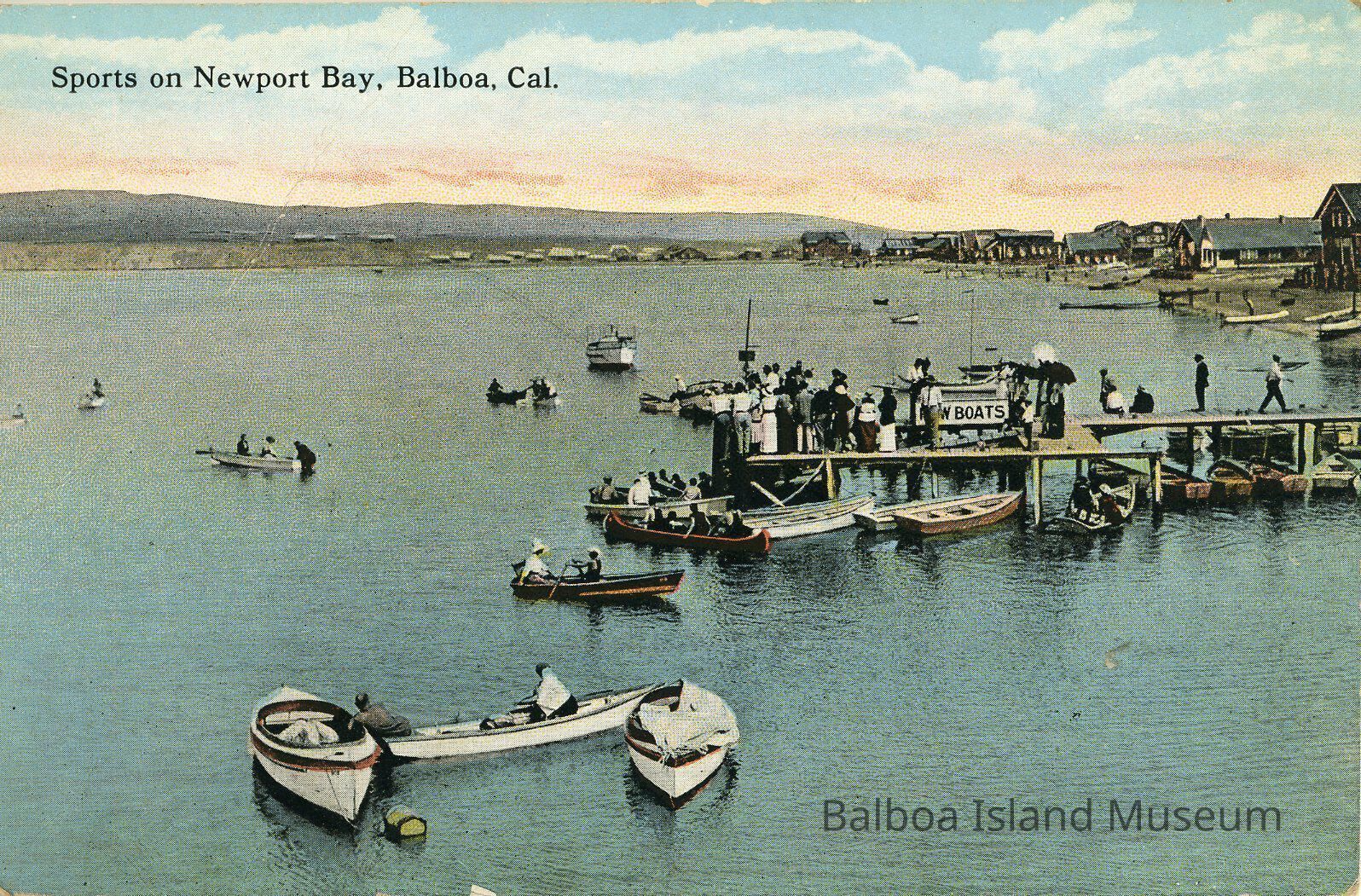 A colorized postcard photograph of the Newport Harbor and the dock off the back of the pavilion with people crowded around getting into and renting boats. The hills are visible along the background. There is a slim chance this photograph could have been taken from Balboa Island, but the general view of the buildings more resembles what was along the shore beside the Pavilion.