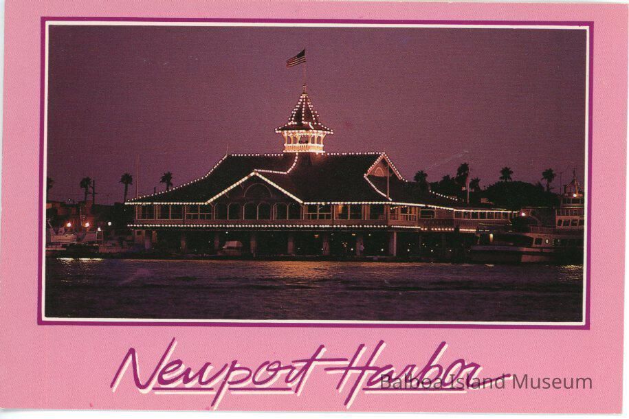 Two copies of a color photograph postcard of the Balboa Pavilion lit up at the end of dusk or in heavy fog at night. The image is surrounded by a white and dark pink frame with a pink border and the words "Newport Harbor" written below in dark pink script with white shadow script.