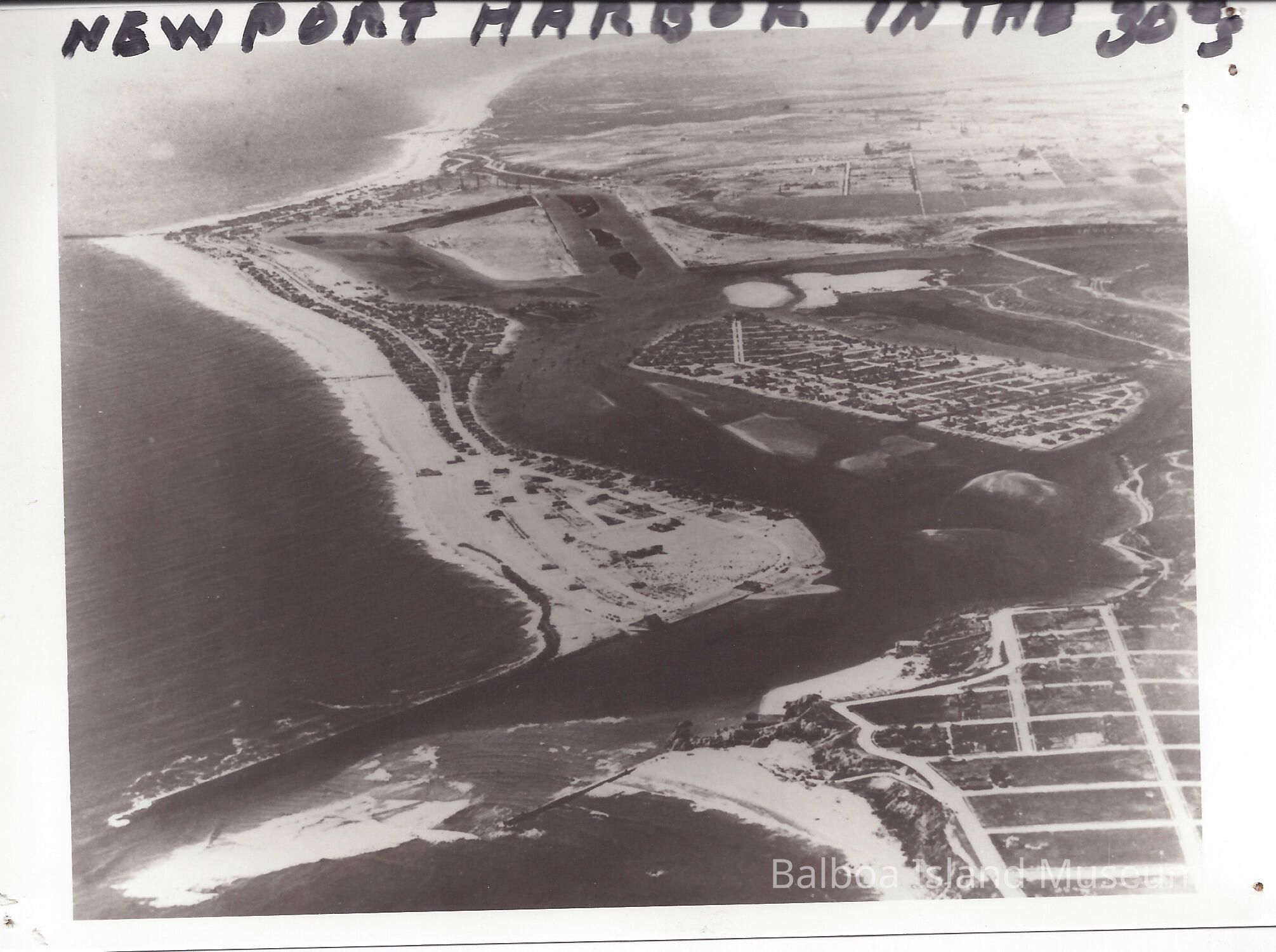 B&W aerial photo of Corona del Mar and harbor. From First American Historical Collection. Reverse says Aerial of Corona del Mar and North taken April 12, 1928.Lexicon