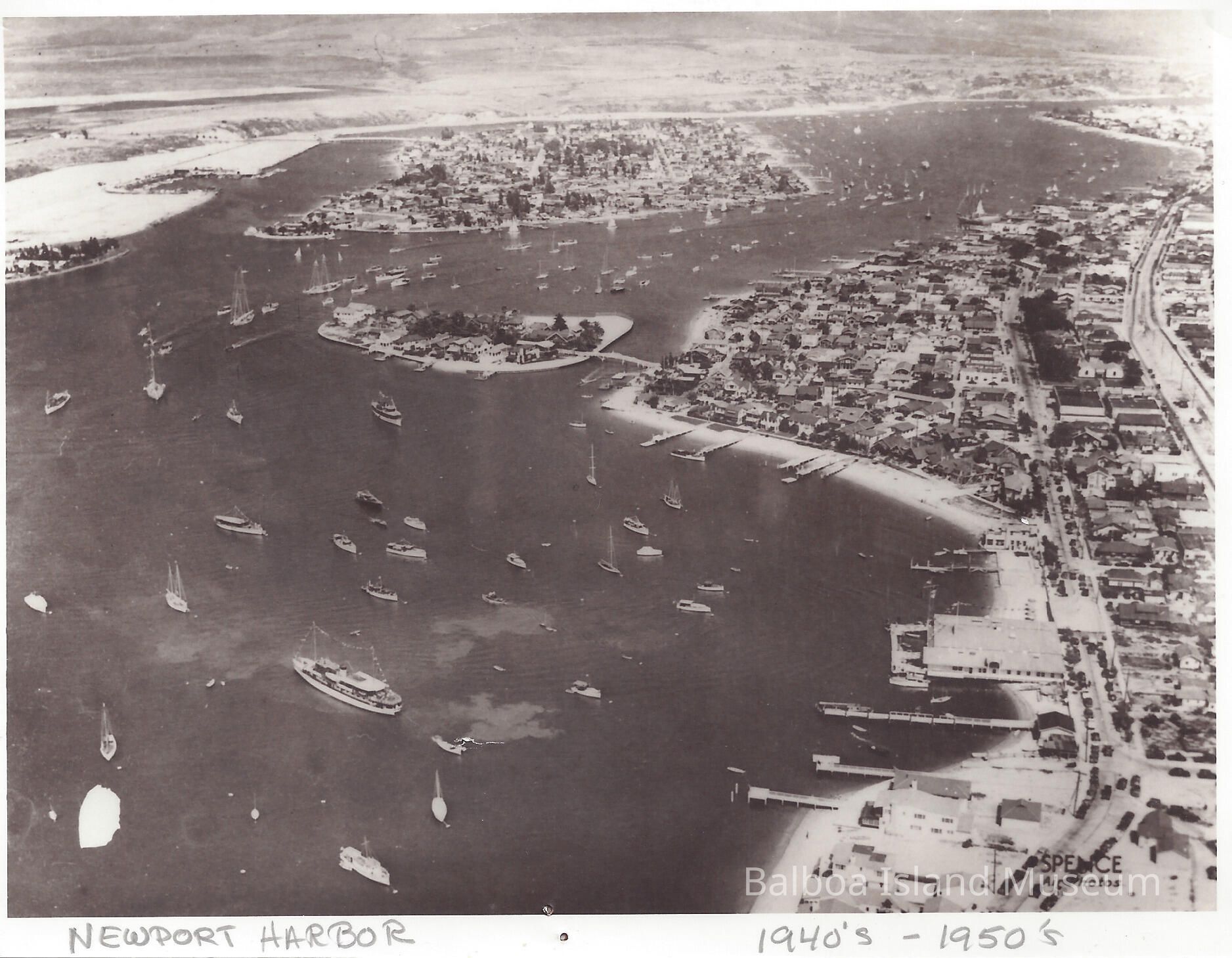 B&W aerial photo of Newport Harbor showing Bay Island, NHYC.Lexicon