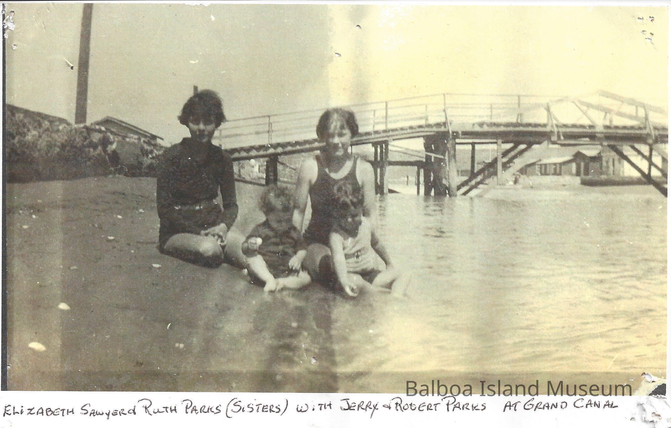 B&W photo of Elizabeth Sawyerd, Ruth Parks, Jerry Parks, and Robert Parks at Grand Canal sitting at waters edge.Lexicon