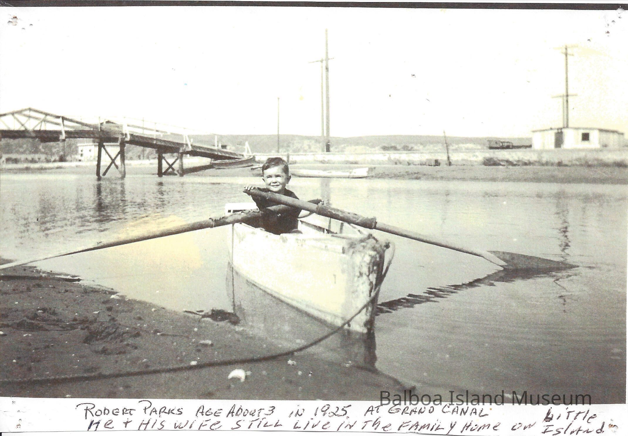 Photograph is of Roger Parks, who is about 3 years old, in a rowboat on Grand Canal in 1925.Lexicon