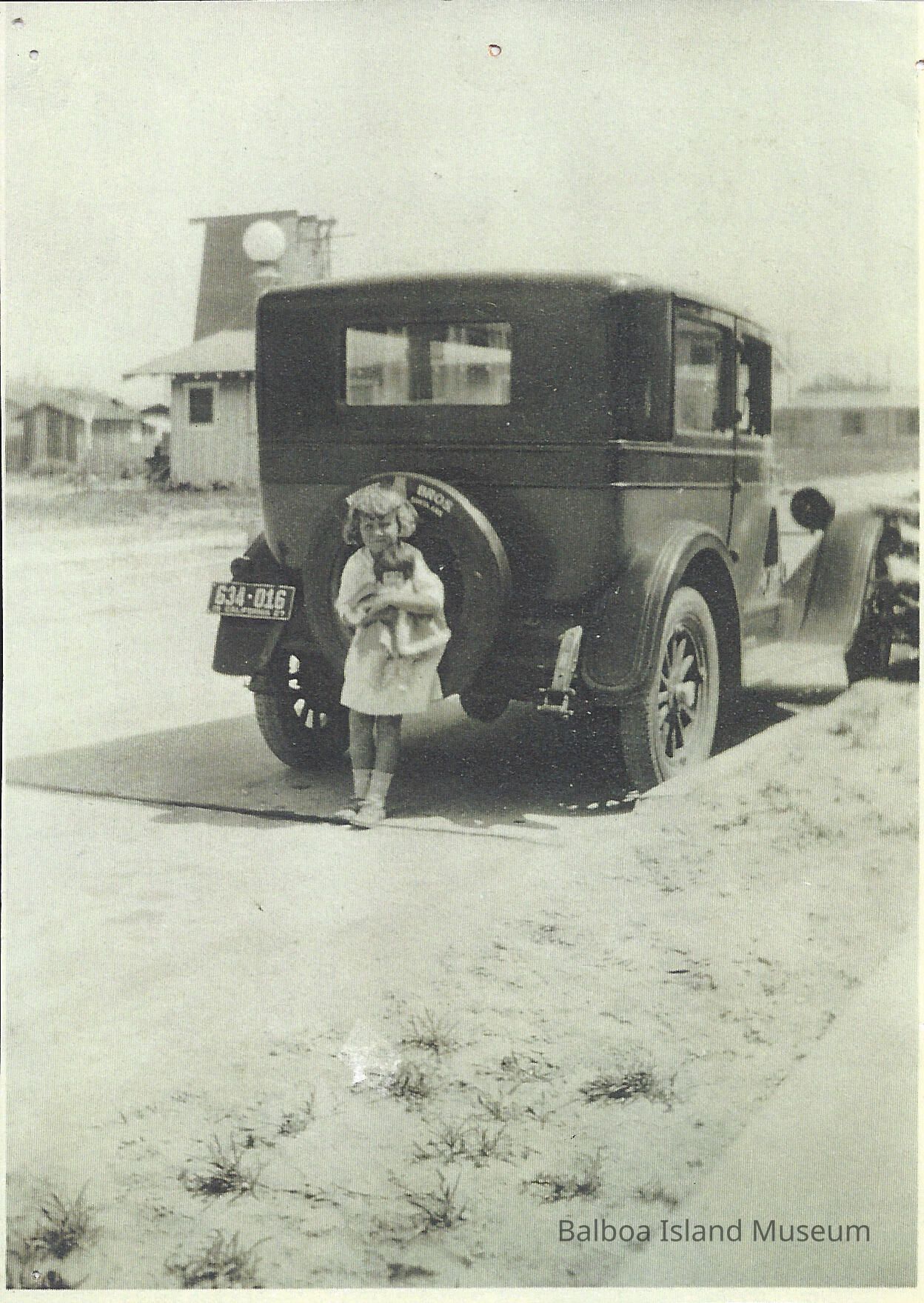 B&W photo of young girl holding a doll standing at back of a car. Reverse says Phyllis Luther in front of Balboa Island property Overland Sedan Car House and tank across street now 117
