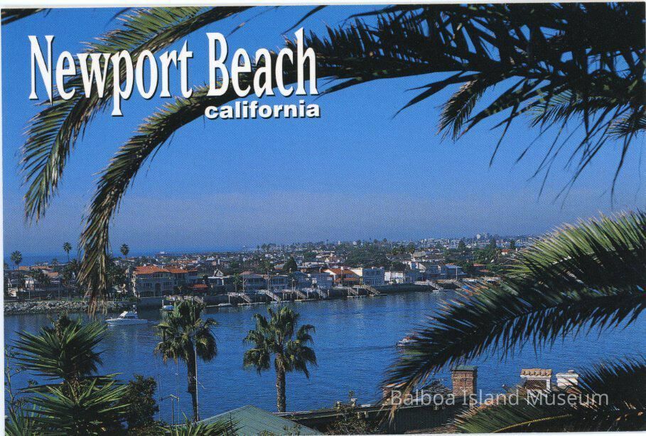 Two copies of a color postcard from Lookout point looking across at the Peninsula between palm fronds. Color.