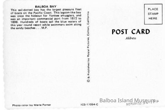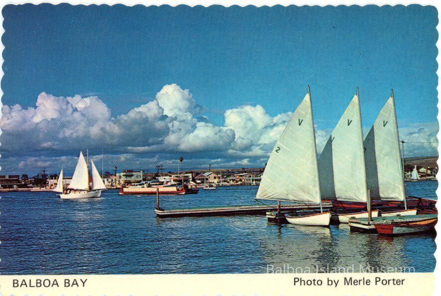 A color photograph of the harbbor with three docked boats to the right and the Ferry passing in the middle of the image. There are large stormclouds and thunderheads visibile int he distance, likely over the mountains. White banner along the bottom with "Balboas Bay Photo by Merle Porter" written inside.