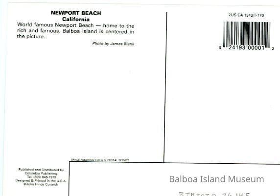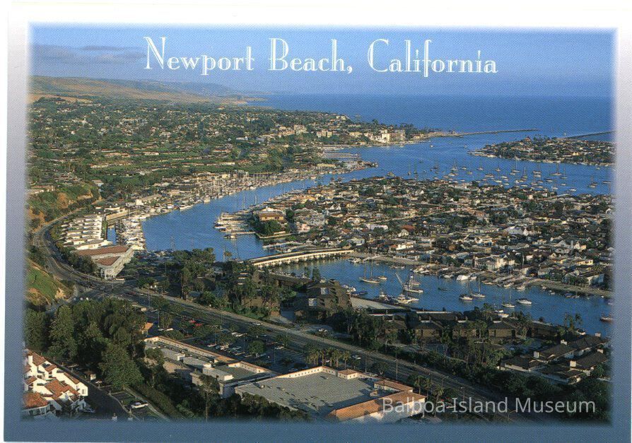 Two copies of a postcard aerial photograph of the east end of the Harbor with part of Balboa Island, the Harbor Entrance, and Balboa Island Channel all visible along with some of the coastline south of Newport. The words "Newport Beach, California" are printed in white across the top of the image and it is it bordered by a gradated blue/white edging.