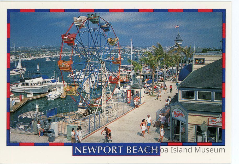 A color photograph of the Fun Zone taken from the third floor of a nearby building. Features the Ferris wheel and the pavilion can be seen in the background. White background with a red-blue dashed frame and "Newport Beach" printed in a blue box.
