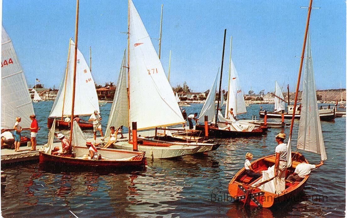 A color photogrpah of several ships being prepared for launch from the docks with people raising sails and chatting on the docks. There is a boat on the right with a flag painted ont he back that is already in the water and heading for the harbor.