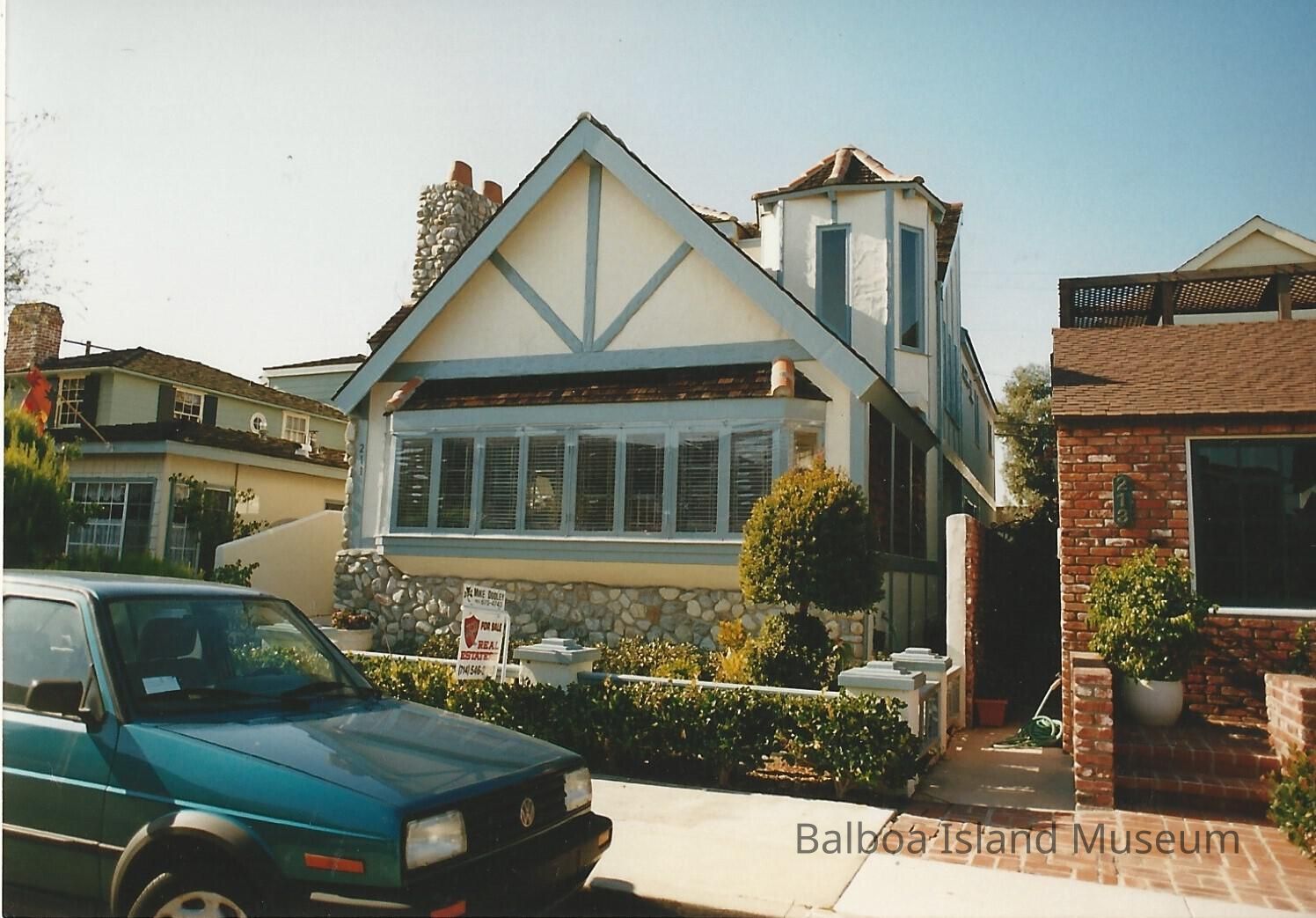 A photograph of the house at 211 Opal Avenue. Built in 1981 in the Tudor style using stucco, wood beams, and river rock.