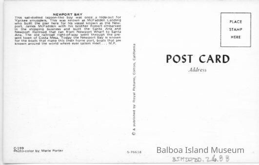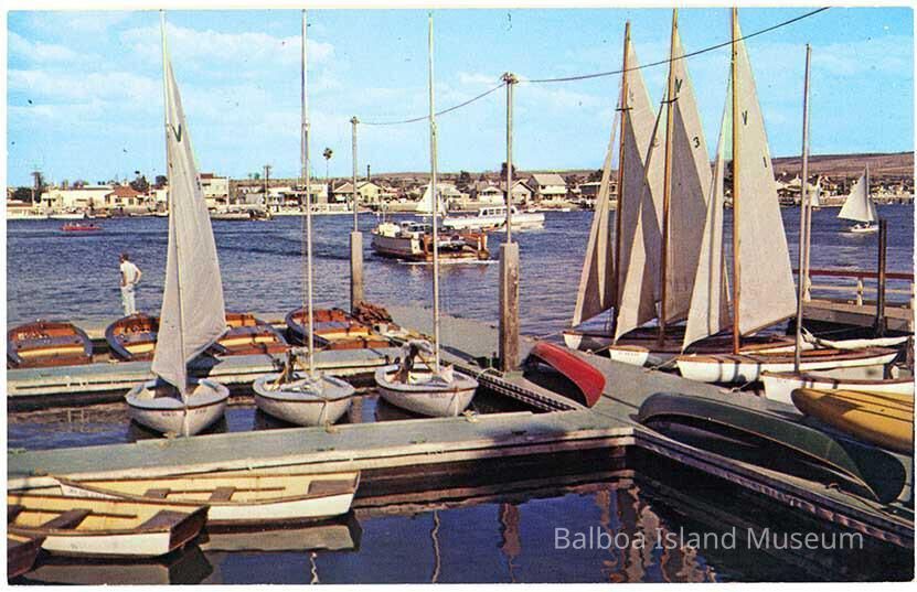 A color postcard of the docks beside the Ferry Landing on the Peninsula looking towards Balboa Island. The ferry is coming in to dock at the Peninsula just behind the docks. Taken from the Vallely docks. Four motorboats are in the first mooring with three sailboats in front of them in the second and two row boats in the first in front of that. There are four more sailboats to the right edge and two canoes on the dock.
