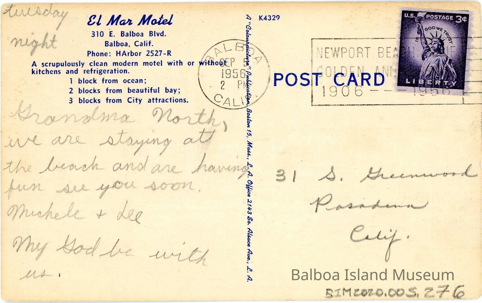 Sent on September 5, 1956 at 2 pm. from Balboa to 31 S. Greenwood, Pasadena Calif and addressed to "Grandma North" from Michele & Lee.