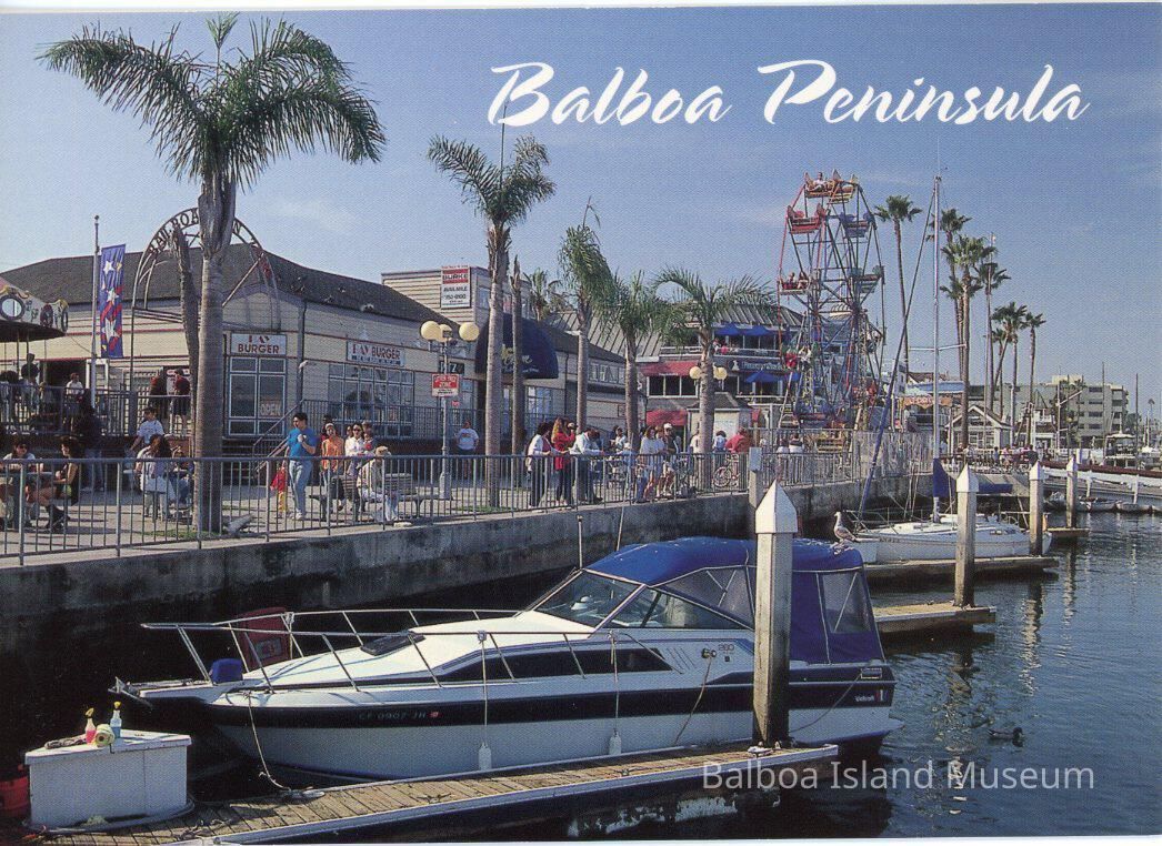 Two copies of a large color postcard of the Fun Zone boardwalk taken from out on a docked boat or dock below the Fun Zone. The edge of the carousel can be seen on the left with the arch sign for the Balboa Fun Zone (red metal) and the Ferris Wheel is at the other end of the boardwalk near the U-Drive sign.