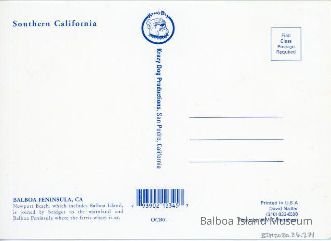 Unused. Published by Krazy Dog Productions. Printed by David Nadler. Photograph by William G. Hartshorn. Postcard number OCB01.Subject