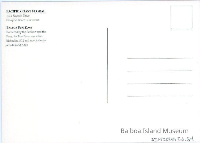 The back has the address for Pacific Coast Floral and some historic information on the Balboa Fun Zone.Creator