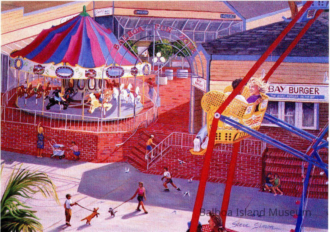 A large postcard with a print of a painting by Steve Simon of the Balboa Fun Zone with the Ferris wheel on the right and the carousel front and center on the left. It was printed as part of a postcard series produce by the City or the City tourist board. The original painting is named "First Kiss" and was an oil painting on a 24 x 36 inch canvas.