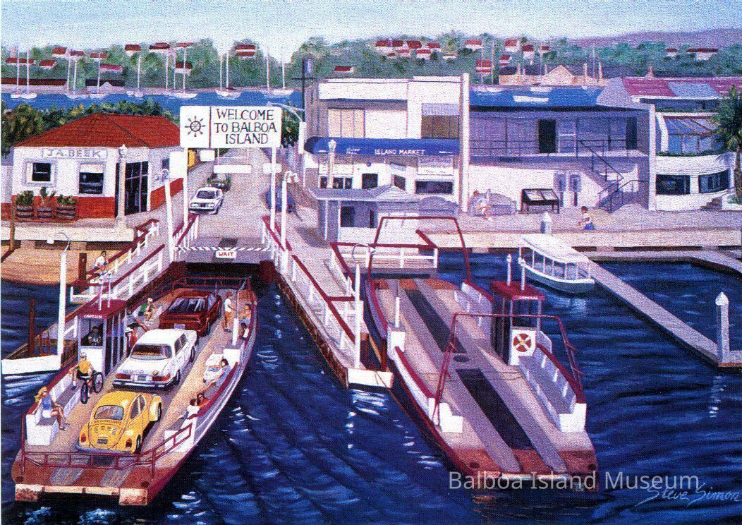 A large postcard with an early painting by Steve Simon of the Balboa Ferry as it is docked on Balboa Island. A painting of the Balboa Ferry as it is docked on Balboa Island. The Captain is pulling up and the Admiral is docked to the right, currently not in use. The original paining is named "Balboa Island Ferry" and was done in oil on a 24 x 36 inch canvas.