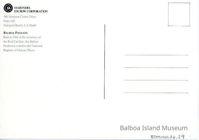 The back has the address for the Mariners Escrow Corporation and some historic information on the Balboa Pavilion.Creator