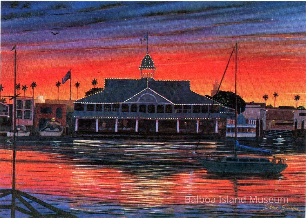 A large postcard with a print of a painting by Steve Simon of the Balboa Pavilion at night lit up against the dusk sky. The painting is done from Balboa Island or a pier off the island. It was printed as part of a postcard series produce by the City or the City tourist board. The original painting is called "Balboa Pavilion" and was an oil on canvas painting, 24 x 36 inches.