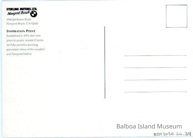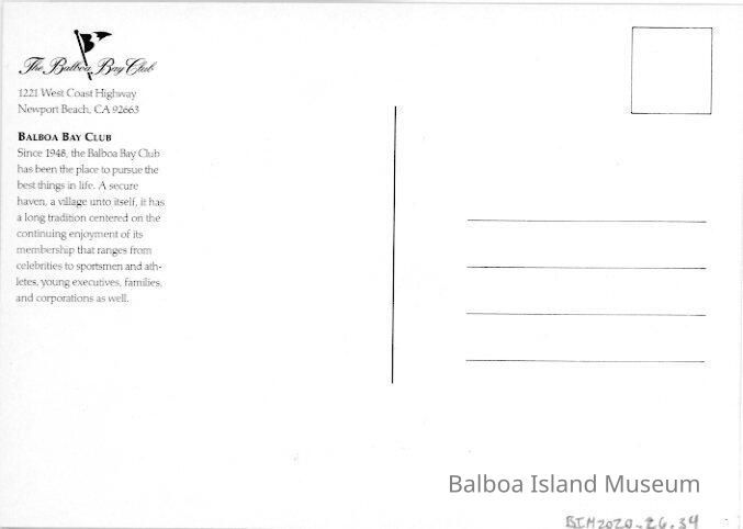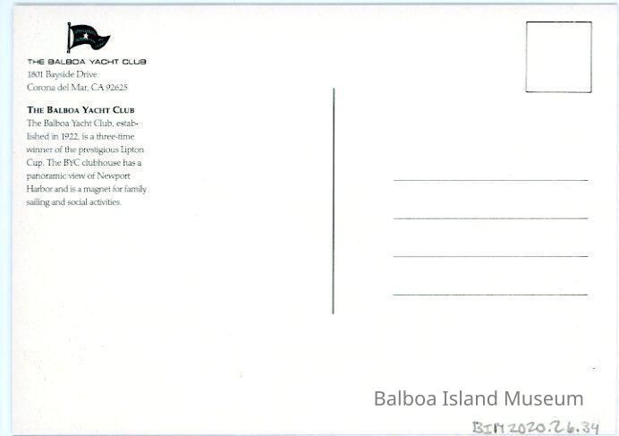 The back has the address and some historic information on the Balboa Yacht Club.Creator