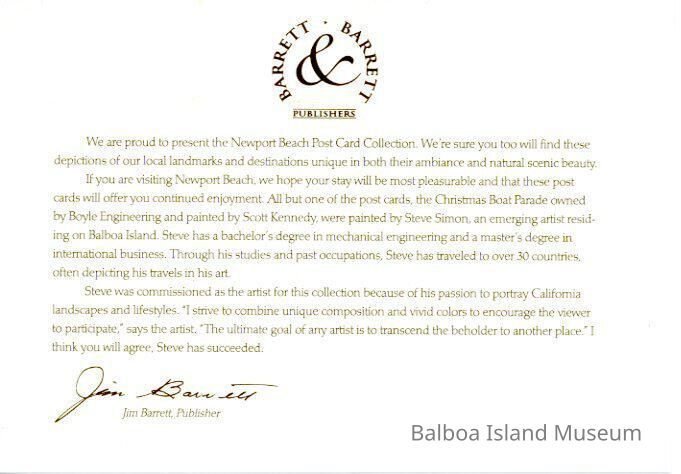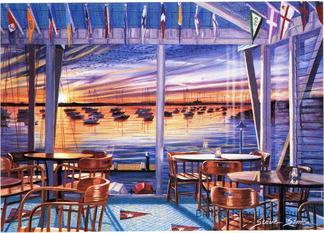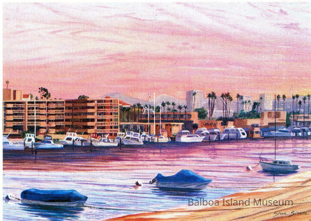 A large postcard with an early painting by Steve Simon done in the dining room of the Balboa Yacht club looking out at the harbor at sunset. It was printed as part of a postcard series produce by Jim Barrett, possibly in conjunction with the city or the city visitors services department. The painting is named Balboa Yacht Club.
