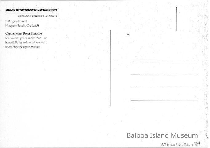 Unused. No publication information, though it is set up in the same format as the Steve Simon postcards printed in series. The back has the address for Boyle Engineering Corporation and some historic information on the Christmas Boat Parade.Creator