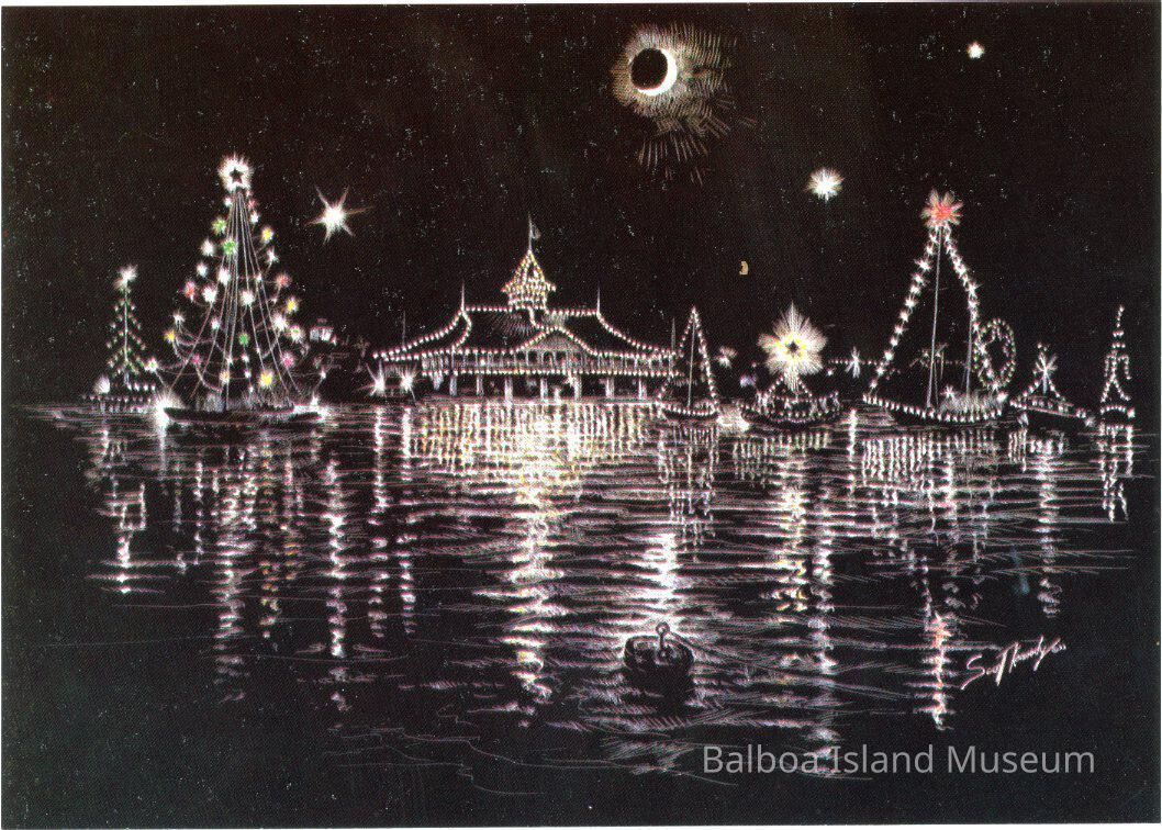 A large postcard print of a painting by Scott Kennedy of the Balboa Pavilion during the Christmas boat Parade. There are boats in the water lit up as is the pavilion. Painted at night. The back has the address for Boyle Engineering Corporation and some historic information on the Christmas Boat Parade.Creator