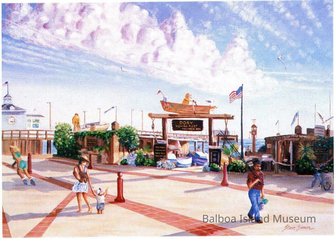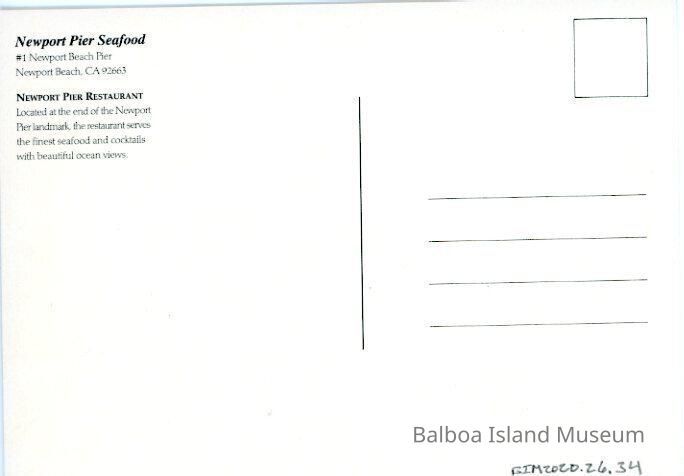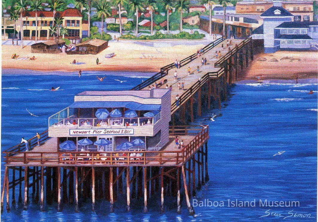 A large 5" x 7" postcard created by Steve Simon as part of a Newport Beach postcard series. The image features a painting of the Newport Pier Seafood & Bar restaurant at the end of the Newport pier. The image is based on a hovering aerial photograph maybe fifty feed above the water with the building still in perfect view on the end of the pier. The back has a small location note and an advertisement for the Newport Pier Seafood restaurant.Creator