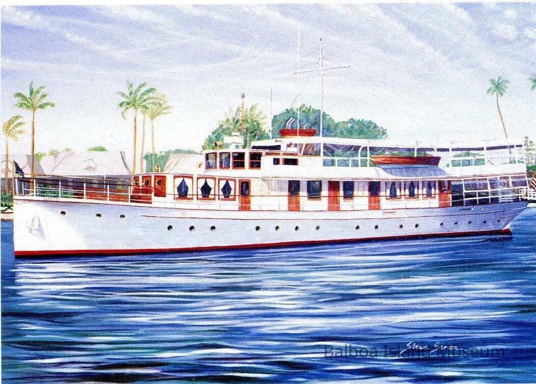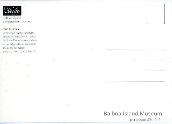 A large 5" x 7" postcard created by Steve Simon as part of a Newport Beach postcard series. The image features a painting of the Electra, a 1929 boat available for rent in the Newport bay. It is white and brown and the back describes it as a 100' fantale. The back has a small location note and an advertisement for Electra cruises.Creator