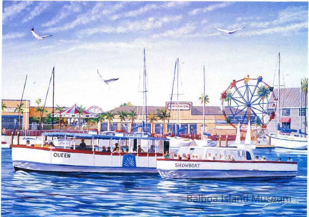 A large postcard with an early painting by Steve Simon of two boats passing in front of the Fun Zone. One is called "Queen" and another is called "Showboat". It was printed as part of a postcard series produce by the City or the City tourist board. The original title was "Fun Zone Boat Co." and was painted in oil on a 24 x 36 inch canvas.