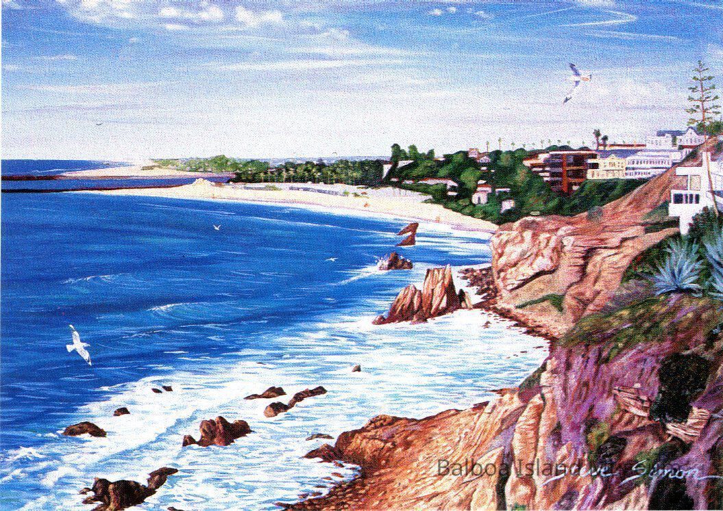 A large postcard with an early painting by Steve Simon of the Corona del Mar beach, harbor entrance and the area just below the cliffs that run beside the beach. Painted from inspiration point. It was printed as part of a postcard series produce by the City or the City tourist board. The original painting is named "Corona del Mar Coast" and was done in oil on a 24 x 36 inch canvas.
