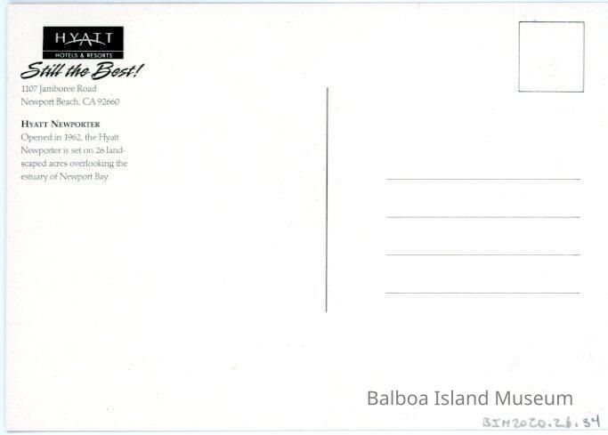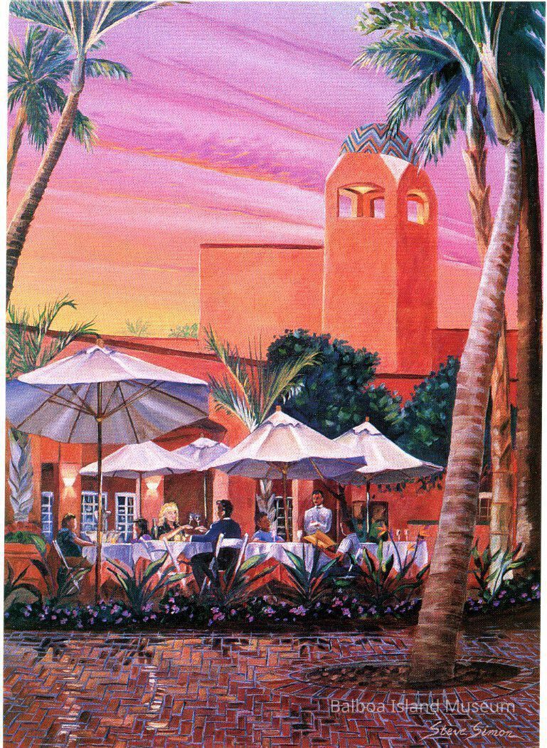 A large 5" x 7" postcard created by Steve Simon as part of a Newport Beach postcard series. The image features a painting of the patio of Hyatt Newporter restaurant with one of the hotel's towers in the background at sunset. The card is set up vertically rather than horizontally. The back has a small location note and an advertisement for the Hyatt hotel.Creator