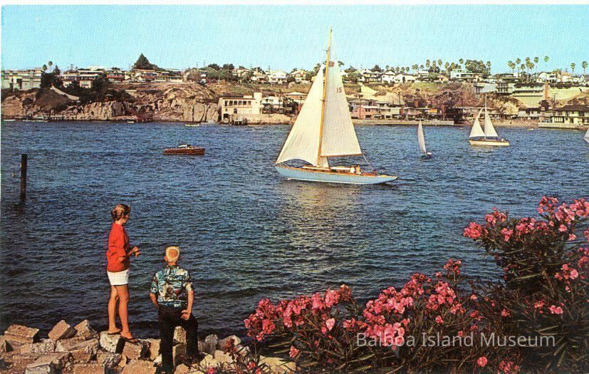 A color postcard of Newport Harbor taken from the Peninsula area across from China Cove with sailboats passing through the water. There are two people standing on a pile of rocks in the foreground.