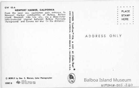 Unused. Published by Golden West. Printed by Dexter Press. Photographed by George E. Watson. Postcard number GW 48-A. Print number 32007-B. Copyright 1960 by George E. Watson.Subject