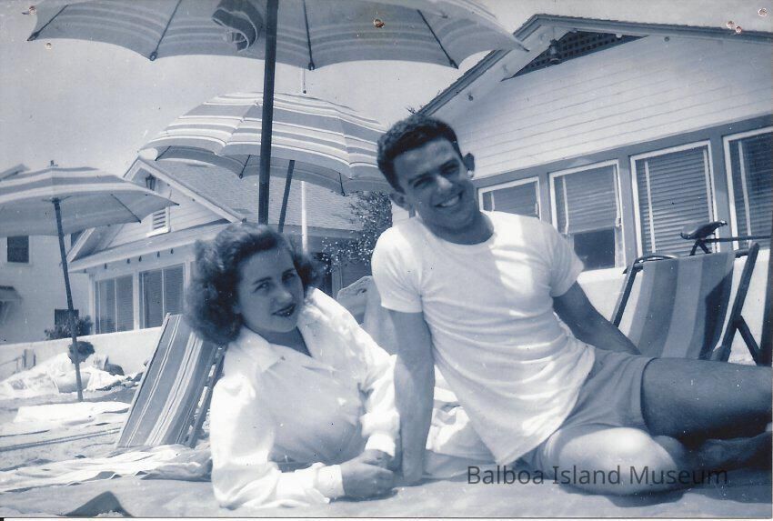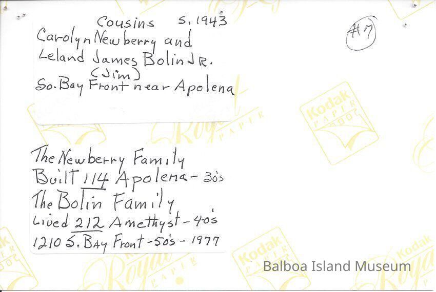 B&W photo of cousins Carolyn Newberry and Leland JAmes Bolin Jr. (Jim) laying on the beach on South Bay Front near Apolena. Reverse has the history of houses lived in by the Bolin and Newberry families.