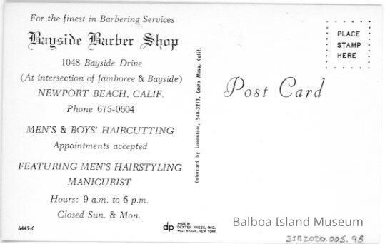 The back advertises hours and services. There is no room allotted for a message, only an address. The "colorcard" is by Locantore in Costa Mesa and it was printed by Dexter Press in West Nyack. Postcard number 6445-C. Likely, Locantore was hired by the barber shop or the shopping center to produce the advertising postcards. Never sent. Stamp box reads "Place Stamp here" inside a dotted border.Subject