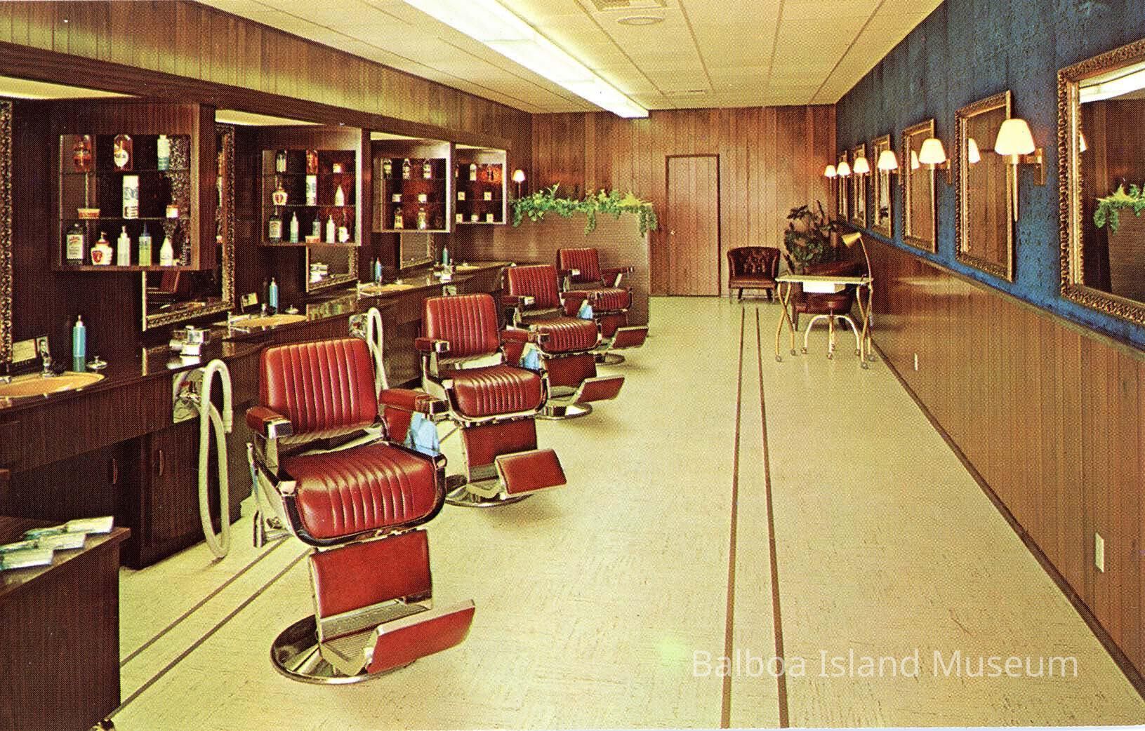 A color photograph postcard of the inside of Bayside Barber Shop at 1048 Bayside Drive. The inside has a line of four barber chairs on the left, mirrors on the right, and a manicurist's station at the back. The business was located inside the Bayside Shopping center immediately across from the entrance to the island.