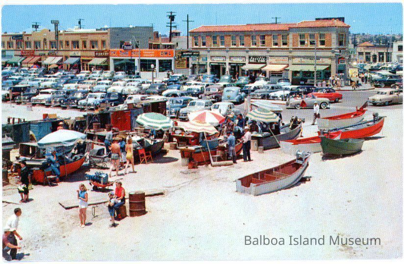 A color postcard of the dory fish market on the sand off West Oceanfront Avenue. The street front can be seen behind it.