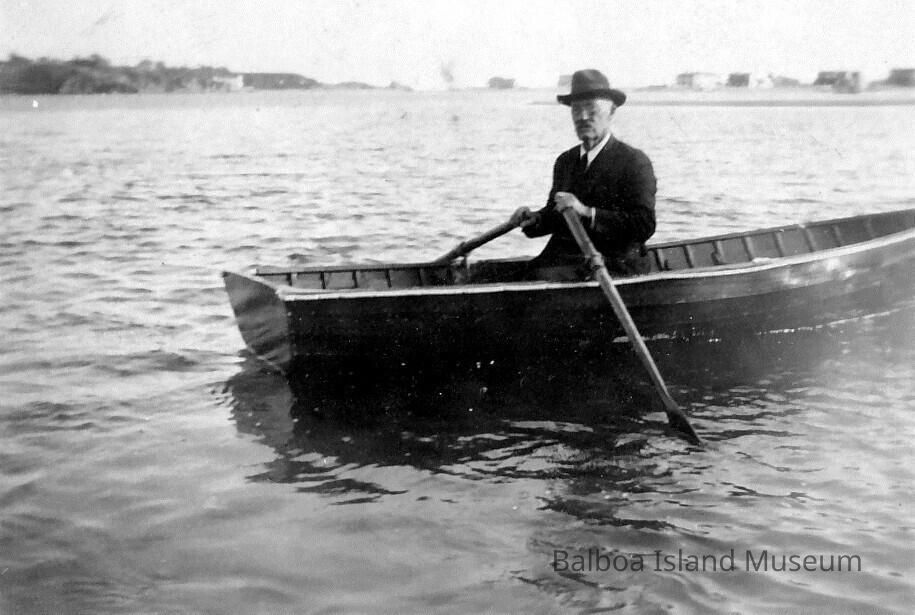 B&W photo of man rowing a boat. B. F Childs.