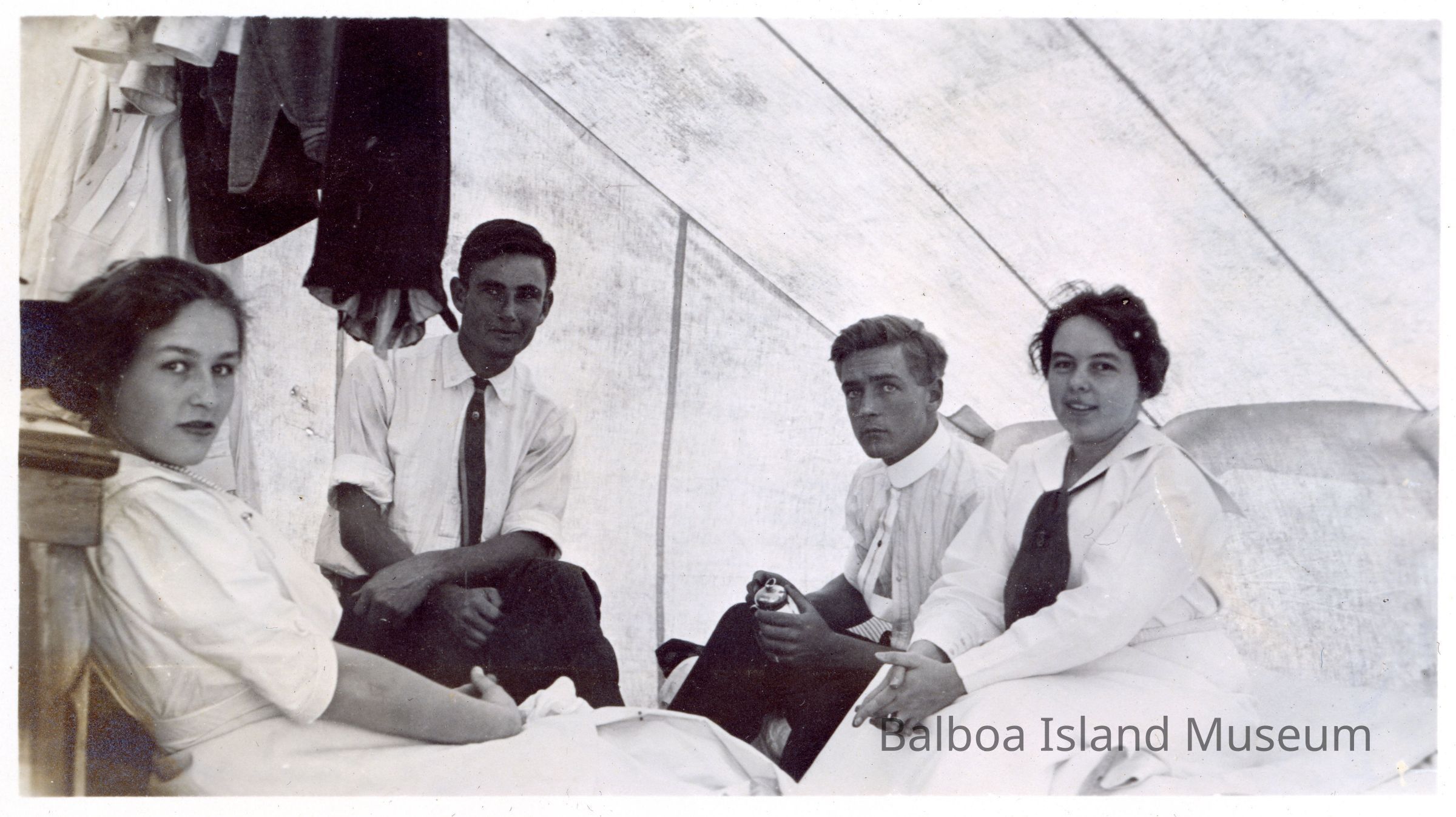 A photograph of two boys and two girls inside their tent on Balboa Island. There are some clothes hanging from the center pole of the tent. The two boys are seated near the back with the two girls on opposite sides at the front. The man in the back right might be Kenneth Smith. Taken around July 4, 1911. Adhered to black album page 2.