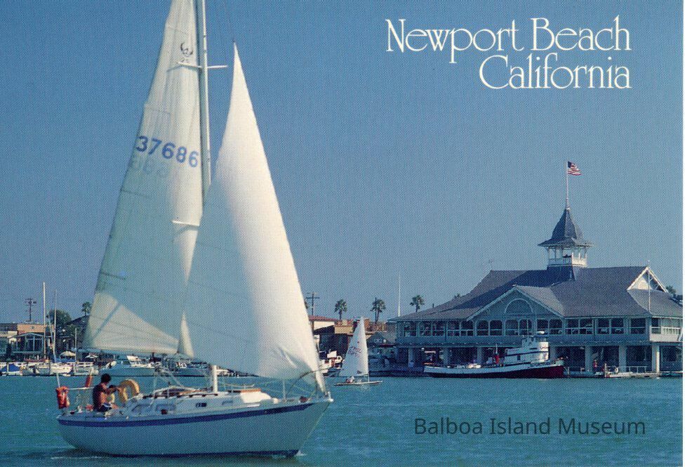 A color postcard of the Balboa Pavilion taken from the west on Balboa Island. There is small yacht about to pass in front of the Pavilion. Boat sail number is 37686.