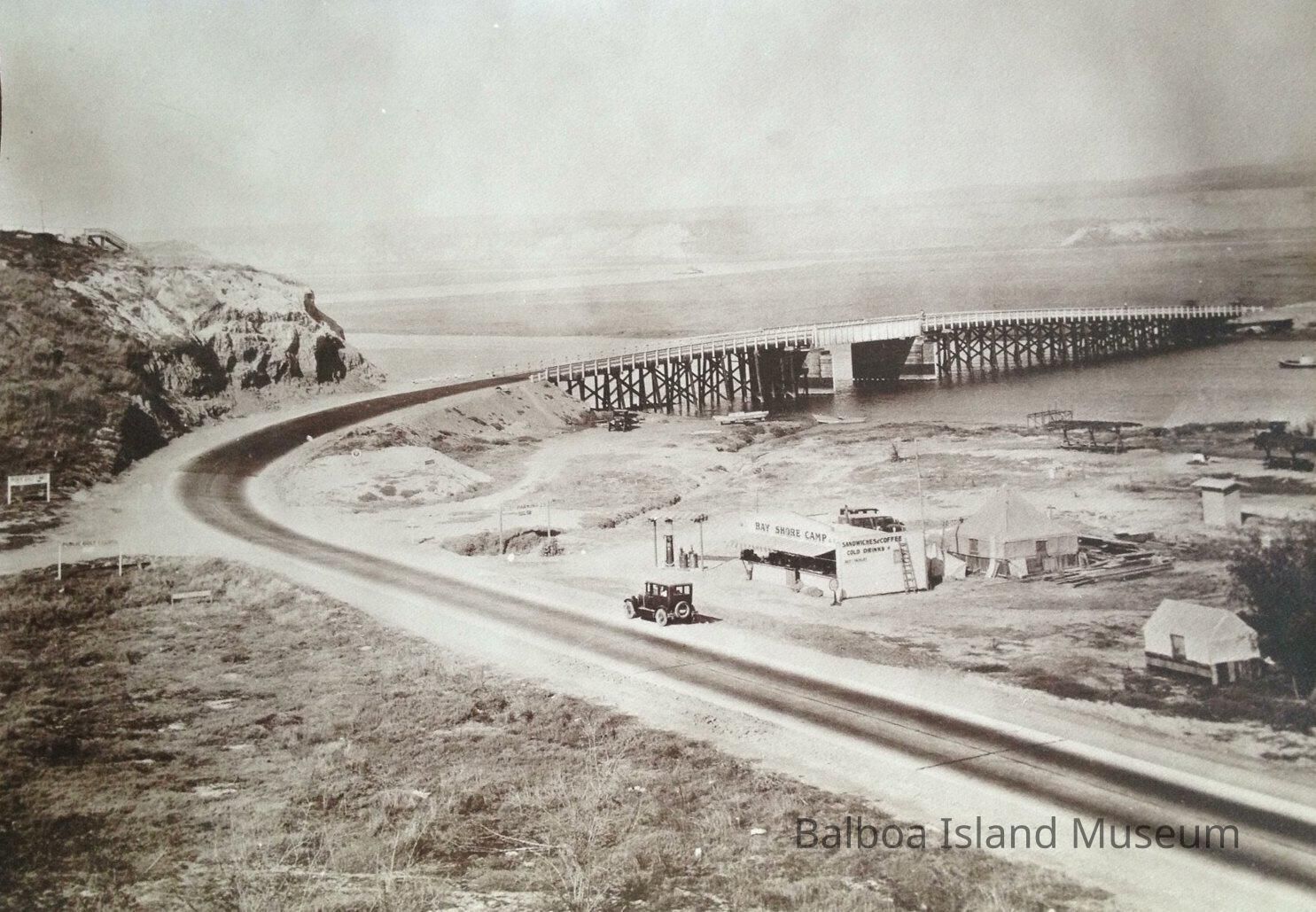B&W photo of Bay Shore Camp at PCH and Back Bay. The photograph was taken from around Castaways Park.