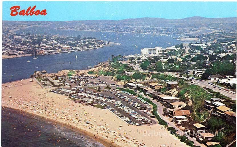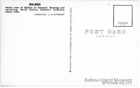 A color postcard of the Corona del Mar state beach taken from the air looking towards the harbor. The scene was mistaken for Balboa as indicated by the name in the upper left corner in red.