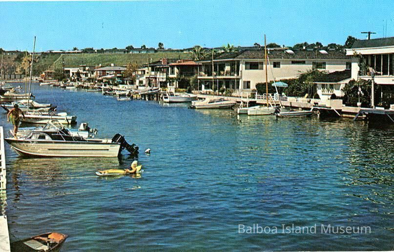 A photograph looking down Grand canal towards Irvine terrace. Taken from about the middle of the second block. There is a man walking on his power boat and a woman on a raft on the left side.