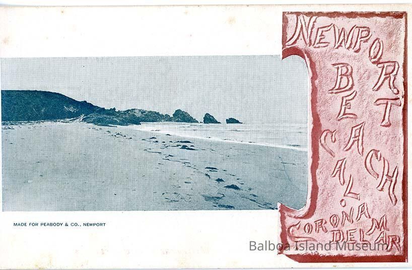 A black and white image of the Corona del Mar beach with a red clay piece insert on the right with the title on it. The right piece is a photograph of an engraved piece of clay with the title information. The beach is a long stretch of sand with the cliffs at the other end and was probably taken from around the location of the jetty or a little further down.