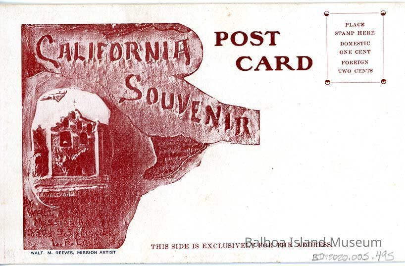 Unused. Published by Peabody & Co., Newport. Made by Walt. M. Reeves. Stamp box is a solid box with circles that resemble half moons in the corners and "Place Stamp Here Domestic One Cent Foreign Two cents" inside. One side is only for the address. The other appears to have space for a message on either the top or bottom, though it is not clear if that is the case or not. The back also has a photograph of a piece of clay with "California Souvenir" on top and a mission-looking carving beneath with the artist's information below that.Subject